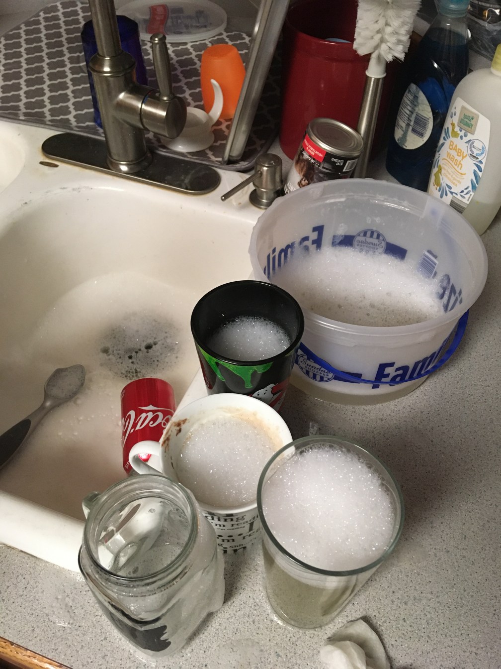 “My hands are dirty,” he said, stepping down from the stool. He headed to the sink and, as usual, commented on all the bubbles washing his hands made. Inspired by “bubbles”, I filled the sink with soapy water and brought his step stool over to the sink.