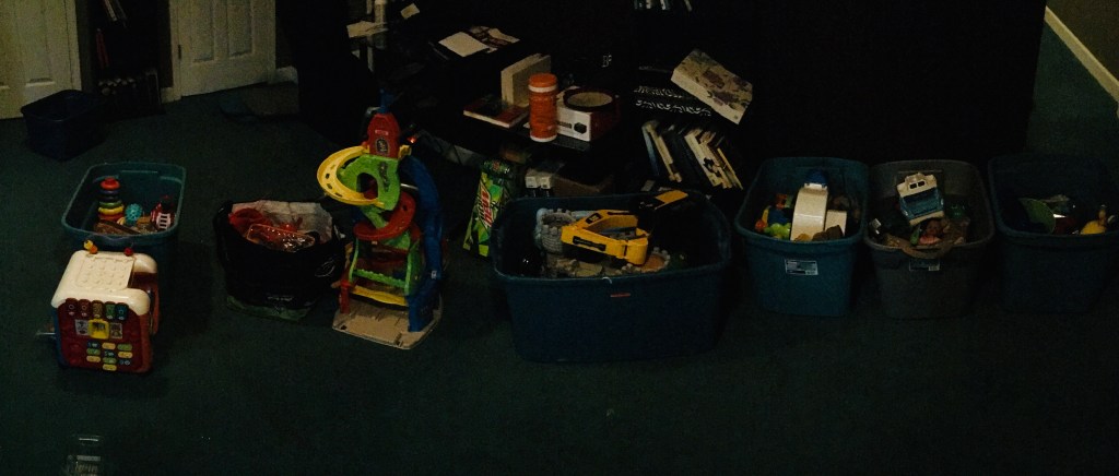 I do not label the bins. I also have no idea if I’ve got the categories right. But I spent maybe an hour taking this (some toys not pictured)